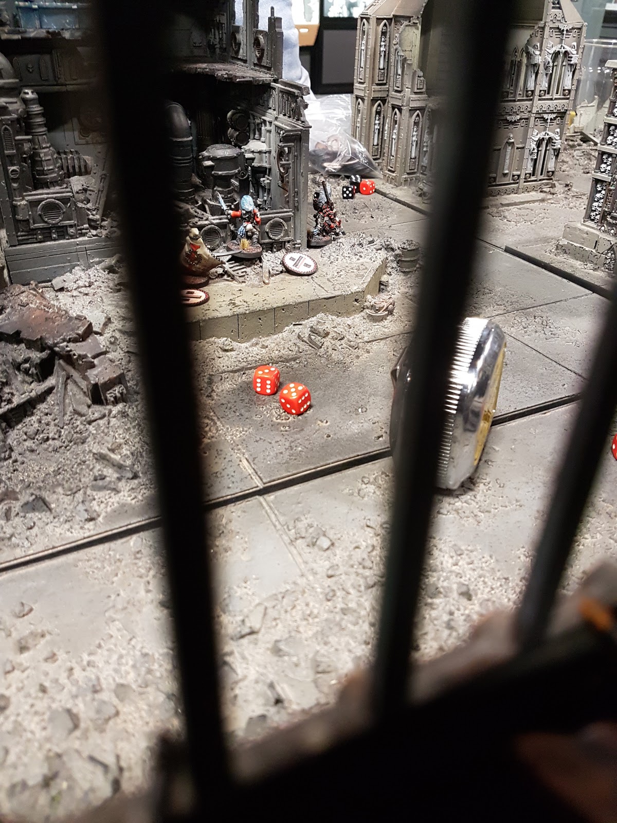 I had almost nothing to answer the storm Bolter (that looks suspiciously like a heavy bolter) and we ended up chasing each other round the limited amount of cover in the centre of the board.